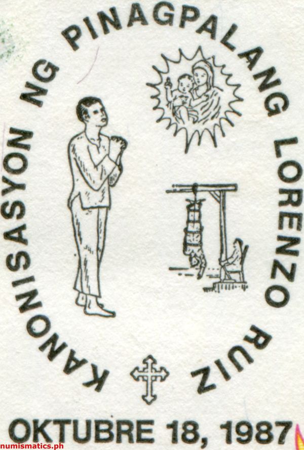 Image of Saint Lorenzo Ruiz, image of Him hanged upside down, image of a cross, image of Mother and Child "Kanonisasyon ng Pinagpalang Lorenzo Ruiz" ""