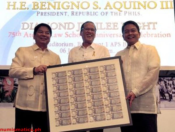 President Benigno Aquino III, on received the uncut sheet of 32 2011 100 Piso 75 Years Ateneo Law School Commemorative Banknote during the celebration of the 75th anniversary of Ateneo Law School